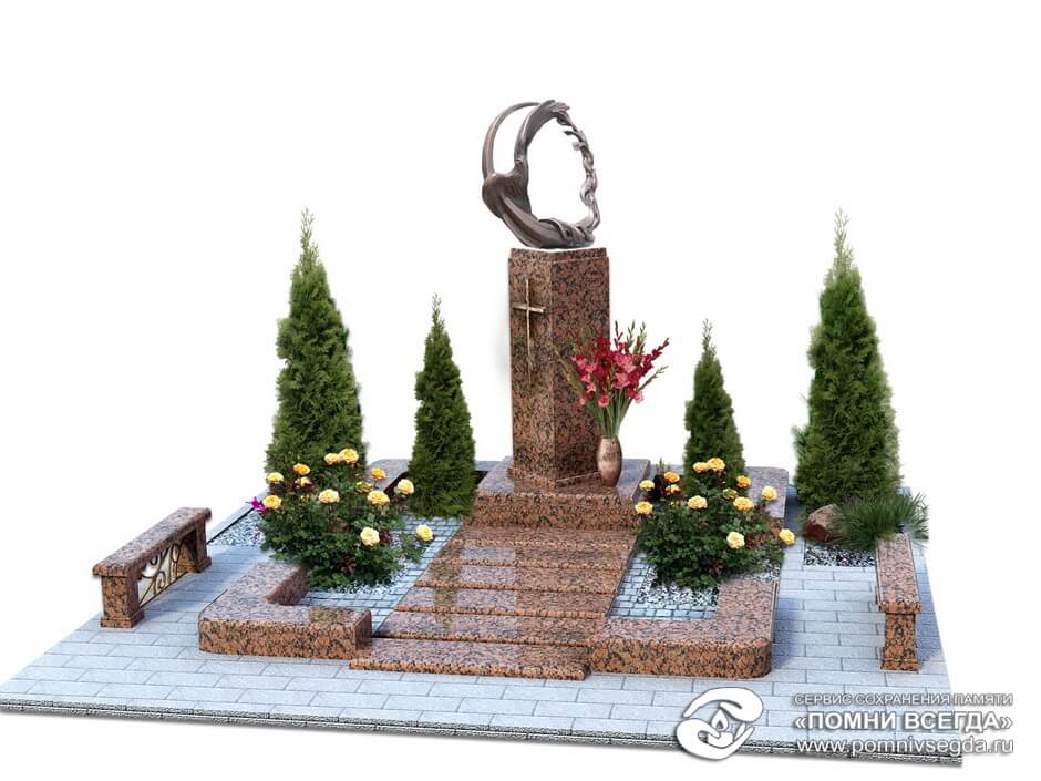 Концепция места захоронения. Комплексное решение. Не стандартный выбор сорта камня. Аккуратное использование растений. Простые и понятные формы. Подойдет и для мужчины, и для женщины. Красивое оформление без явной персонализации.