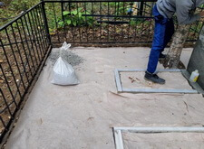 Клиент заказал достаточно экономное покрытие серой гранитной крошкой. Для того, чтобы трава в дальнейшем не прорастала, мы затянули территорию места захоронения (а также пространство внутри цветников) геотекстилем. Параллельно с этим по периметру участка установили железную полосу, препятствующую выпадению крошки за территорию могилы.