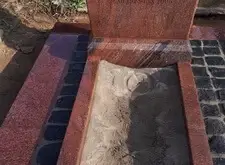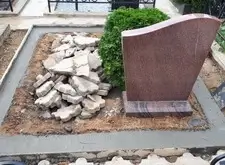Изначально на участке был установлен красный памятник из гранита и гранитный же цоколь. Обращаясь к нам, клиент упомянул о частой проблеме: территория участка постоянно зарастает сорняками и поддерживать могилу к хорошем ему не представляется возможным. Коме травы на самом участке, внешний вид места захоронения портила также начинающая прорастать бетонная плитка.