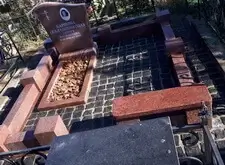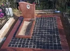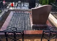 Облицевали бетон полированным гранитом, на территорию участка уложили брусчатку, предварительно приподняв памятник.