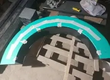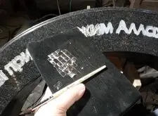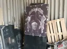 Далее начинается второй этап – переход к созданию элементов памятника. Первая подготовленная деталь – полукруглая арка. Трафарет на арку отпескоструили, сделали надпись сусальным серебром