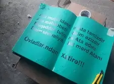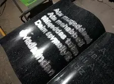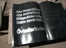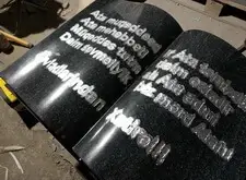 Следующий элемент мемориальной композиции – раскрытая книга. Процесс создания такой же, как и у арки: сначала буквы гравируются пескоструйной машиной, затем грунтуются, и только после этого надпись покрывается клеем и наносится сусальное серебро.