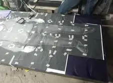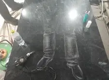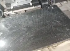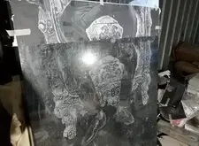 Переходим к созданию портретов на гранитной поверхности. Распечатываем ранее созданный макет, прикладываем его к плите. Под него кладём кальку, обводим ручкой основные линии портрета, убираем всю бумагу. Для проявления линий посыпаем камень тальком.