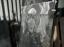 Предварительно станком делается портрет лица усопшего, остальная гравировка – ручная работа. В последнем кадре из подборки представлено ростовое изображение, плита расположена вертикально.