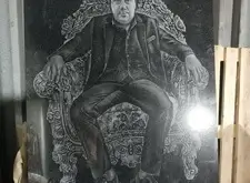 Проводим все те же действия на лицевой стороне памятника, на этот раз гравируем портрет умершего в кресле. Как и с ростовым изображением, лицо выбивается станком, остальное – ручная работа.