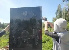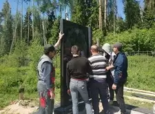 Следующий этап – один из самых ответственных в работе. Плиту, весящую порядка 600 килограмм, требовалось доставить на место захоронения. Для этого понадобились объединённые усилия более чем двадцати человек.