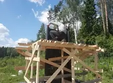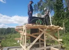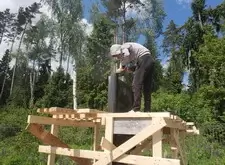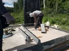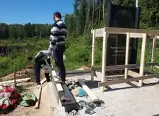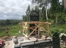 После установки колонн начинаем монтировать арку. Первым делом возводим леса вокруг памятника, так как кран подъехать к могиле не может и всю работу приходится делать вручную. Затем монтируем арку и разбираем леса.