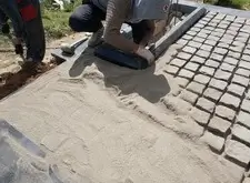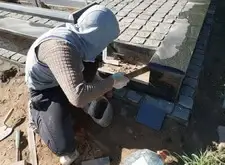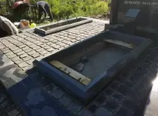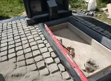 Приступаем к монтажу внутренней зоны мемориальной композиции. Создаём цветники, укладываем на территорию участка брусчатку, которую затем просыпаем пескобетоном. Оформляем ступеньки.