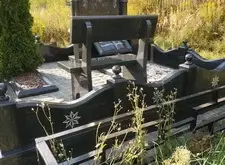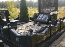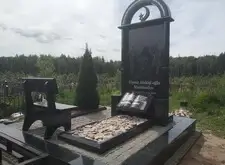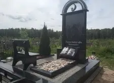 Собираем лавочку, устанавливаем её напротив надгробья. Цветник у подножья мемориальной стелы наполняем светлыми камнями. Под полукруглую арку памятника укрепляем вырезанную из гранита фигуру полумесяца.